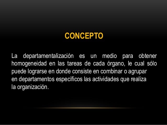 Este principio nos habla de la división de la de la organización que en todo grupo y organización humana existen. Una vez agrupadas las tareas se comienzan a clasificar en grandes áreas; esta actividad le corresponde al administrador o quien esté realizado el plan organizacional, principalmente tendrá que determinar que colaboradores dependen de quien o que departamento depende de otro; de igual manera varían de acuerdo al giro de empresa, tamaño, numero de personas, y las relaciones que vinculan las áreas.