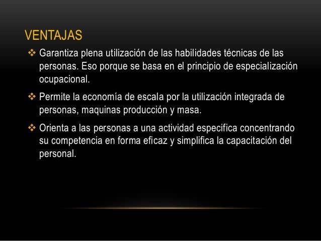 La especialización del trabajo se lleva a cabo mediante la división de las tareas, donde se busca alcanzar que un colaborador sea un experto en su puesto para que sea más productivo ya que se pensaba que no era posible que una persona dominara todas las áreas de una organización. En la actualidad las empresas buscan a personas con una buena actitud para adquirir más conocimientos de lo que su puesto necesita o que cuenten con “multihabilidades”.